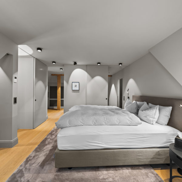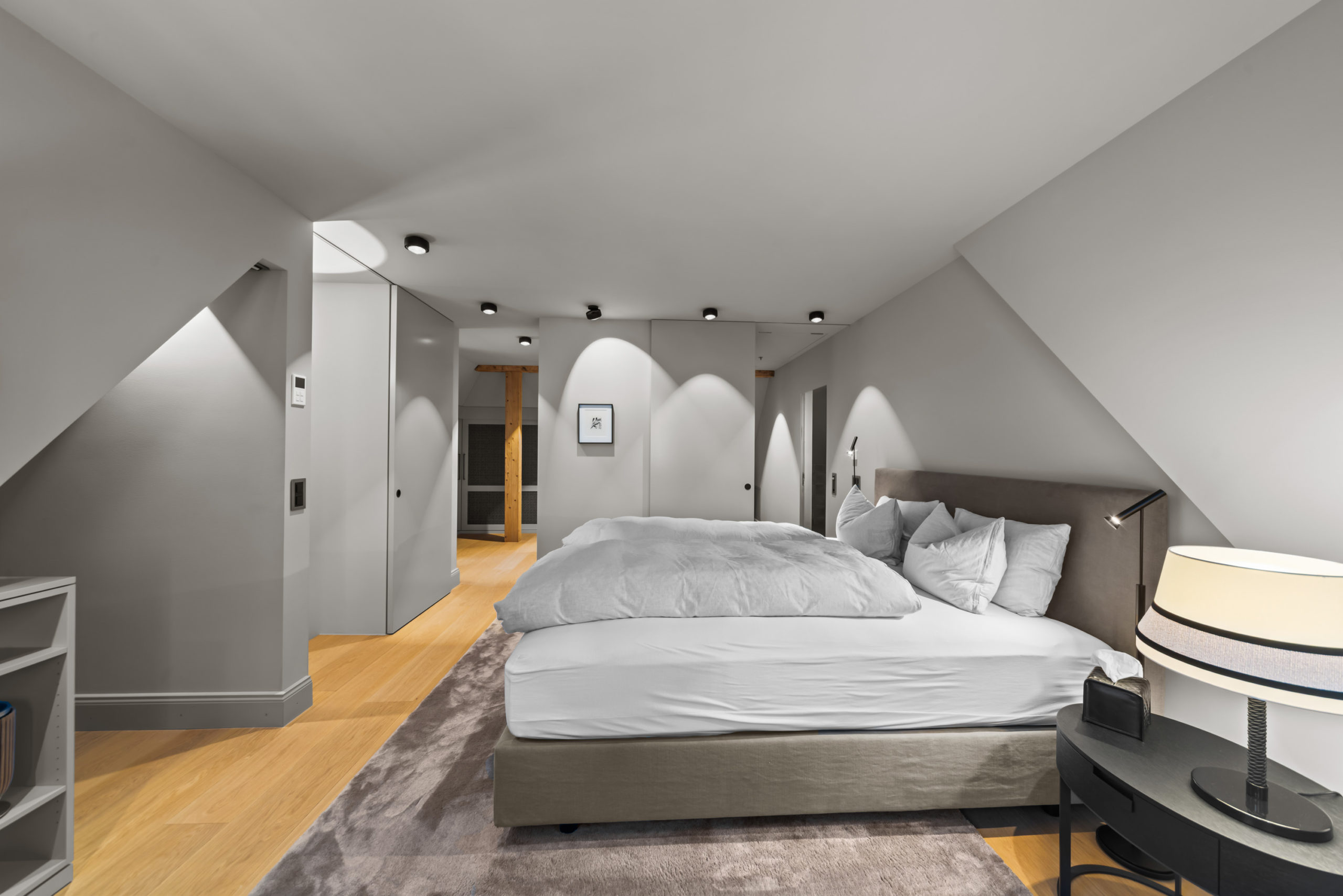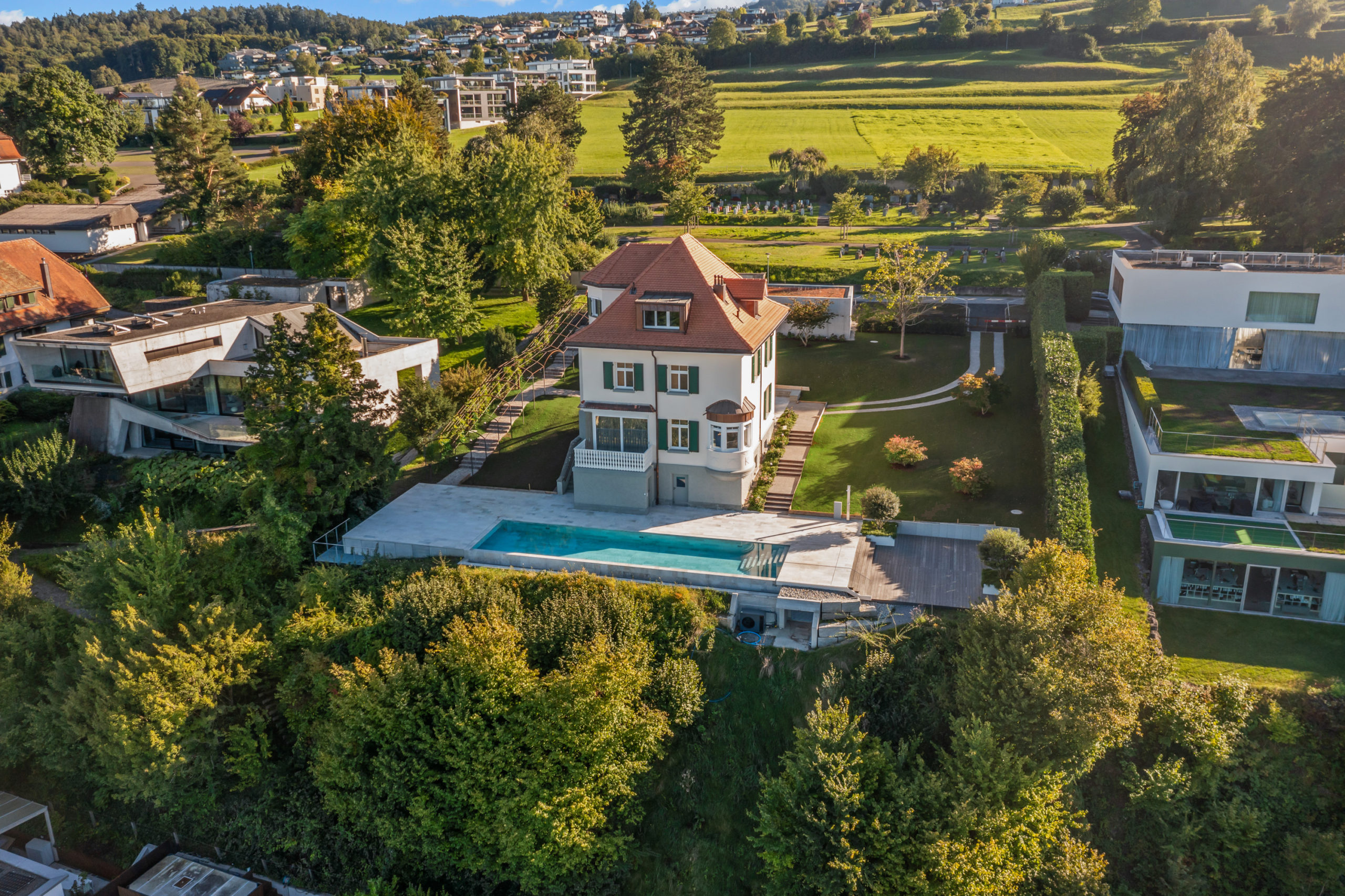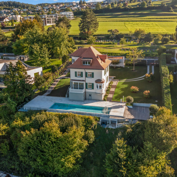 Die im Laufe der Zeit in die Jahre gekommene Villa wurde umfassend und mit höchstem Qualitätsanspruch saniert sowie umgebaut. Rund um einen zentral gelegenen Aufzug gruppieren sich alle Wohn- und Schlafräume. Im Erdgeschoss öffnet sich ein grosszügiger Wohn-, Koch- und Essbereich, das Obergeschoss beherbergt die Schlafräume, während sich im Dachgeschoss der Master-Bedroom mit Ankleide und eigenem Bad befindet. Abgerundet wird das Raumangebot durch einen Wellnessbereich im Untergeschoss mit Sauna und direktem Zugang zur Gartenanlage mit Aussenpool.